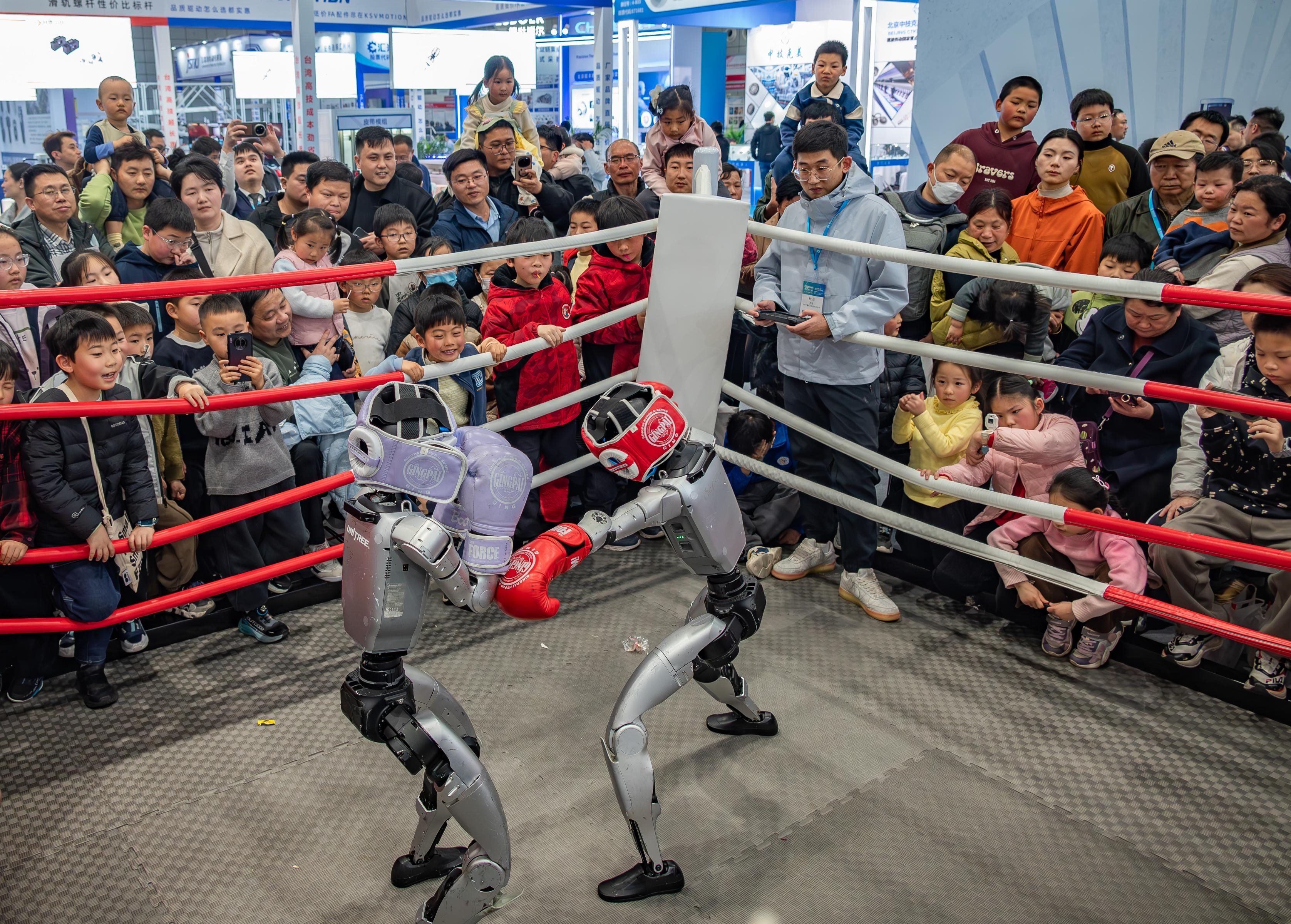 3月14日,2026合肥国际工业自动化暨机器人展览会现场,观众在观看人形机器人拳击比赛。本次展会聚焦高端化、绿色化与智能化,展出范围涵盖工业自动化及控制技术、机器人整机与核心部件、机...