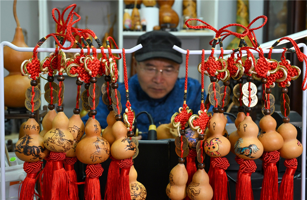 1月22日,省级非遗代表性项目葫芦烙画代表性传承人郑小良正在创作马年主题葫芦烙画。