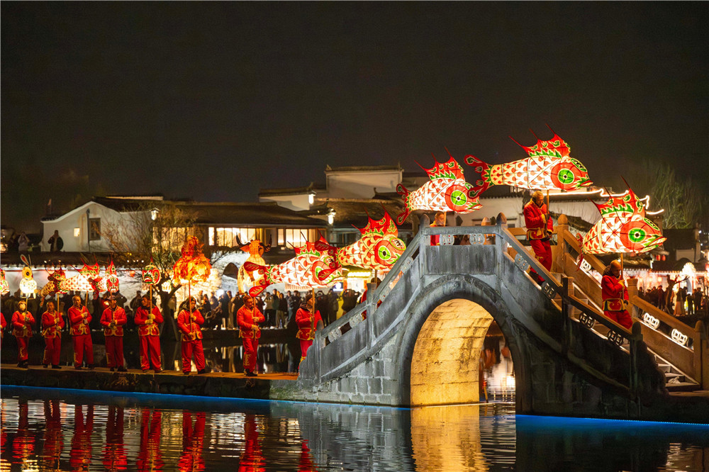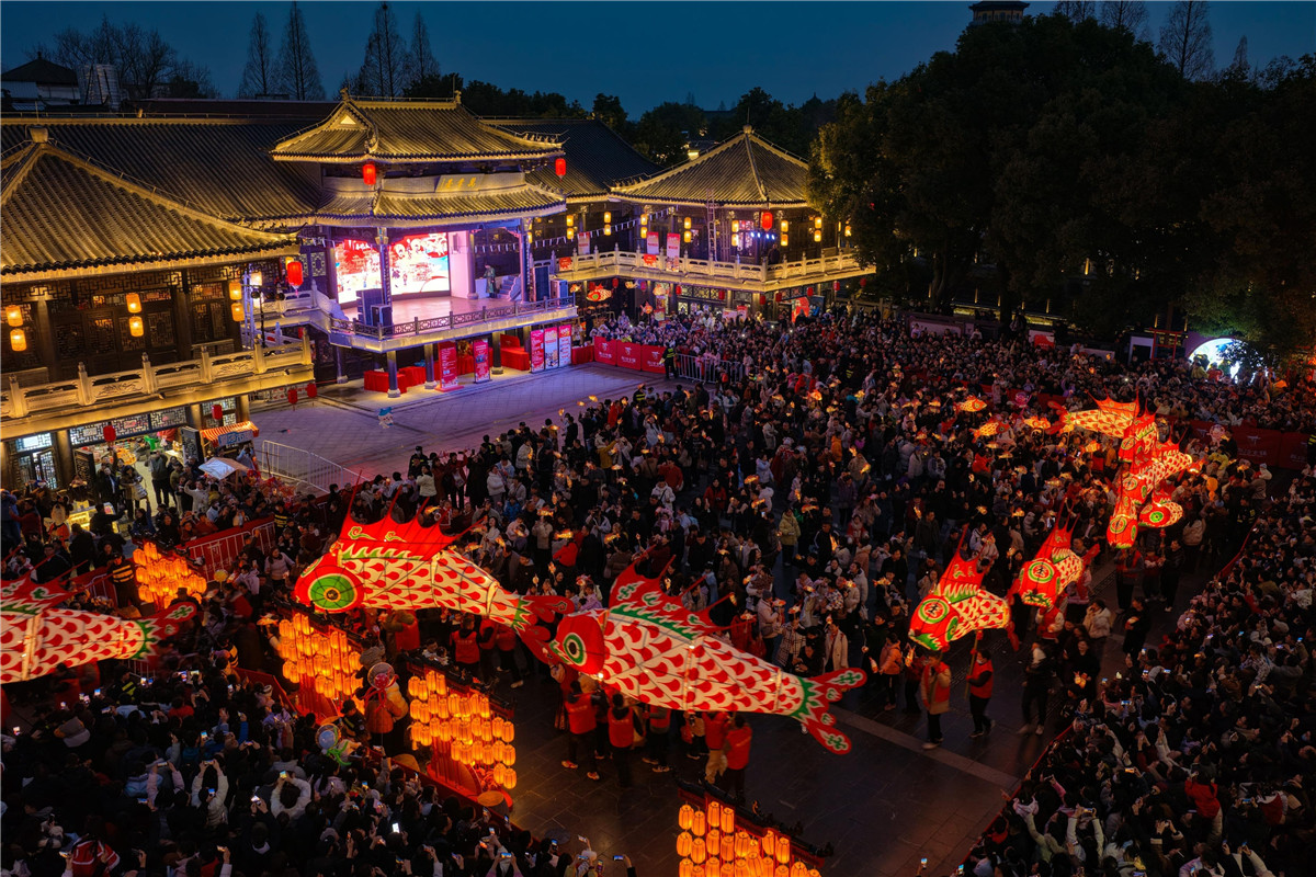 2月18日晚,肥西县三河古镇上千盏徽州鱼灯亮起,带火古镇夜游。本报记者徐旻昊摄