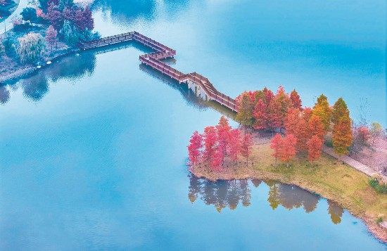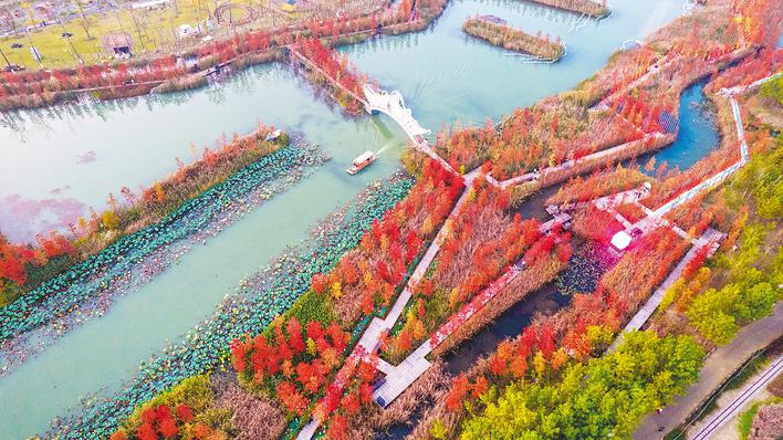 11月15日,合肥市包河区大圩镇磨滩旅游度假区层林尽染,色彩斑斓,如诗如画,吸引众多市民游客前来游玩。(通讯员马二虎摄)
