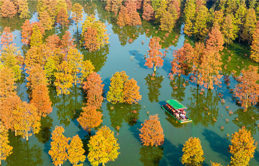 11月15日,随着气温下降,庐江县柯坦镇千年大汉塘里的数千株池杉树树叶已经转黄变红,在初冬暖阳的映照下,勾勒出一幅自然和谐的生态画卷。(通讯员巢志斌摄)