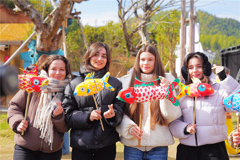 外国游客体验徽州鱼灯。徽州区文旅体局供图