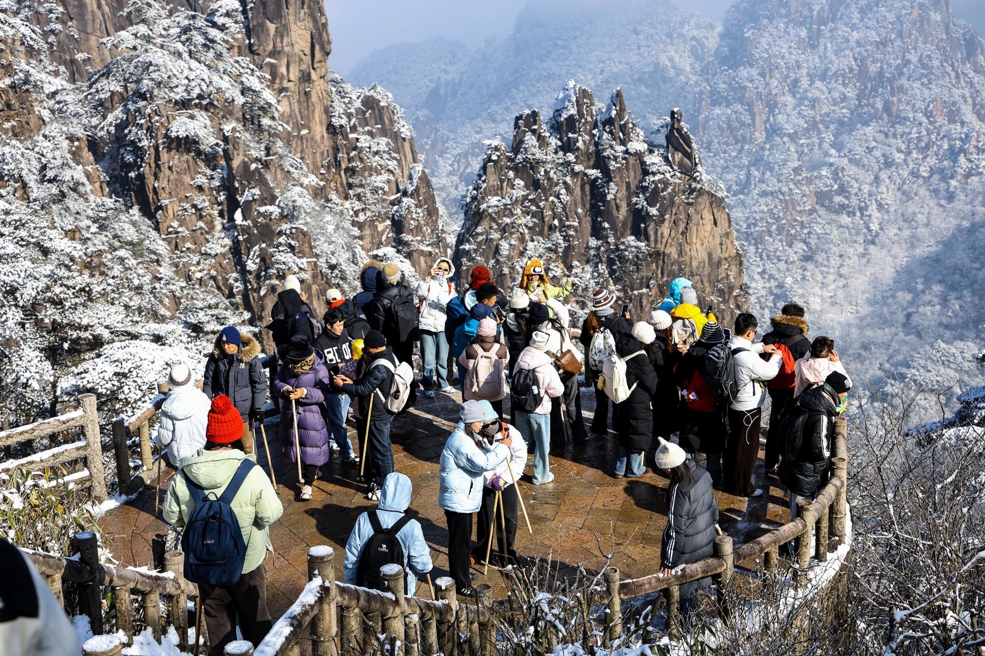 12月25日,黄山风景区雪后初霁,群山银装素裹,如梦如幻,吸引了众多海内外游客登山赏雪。