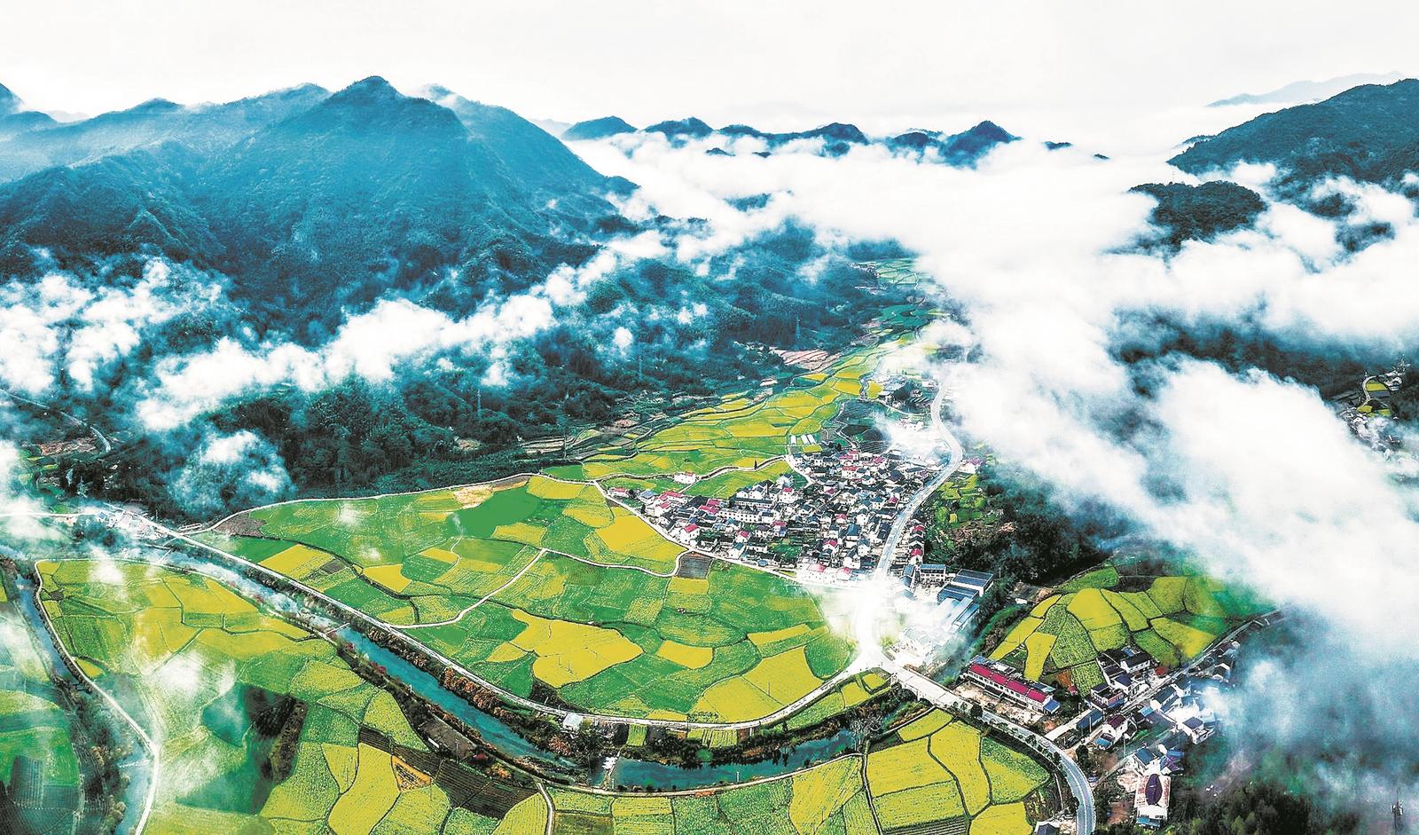 近日,春雨后的池州石台县境内的秋浦河畔,云海缭绕,民居错落有致,油菜花海依山就势与四周环抱的青山绿水相映成景,宛如画卷。