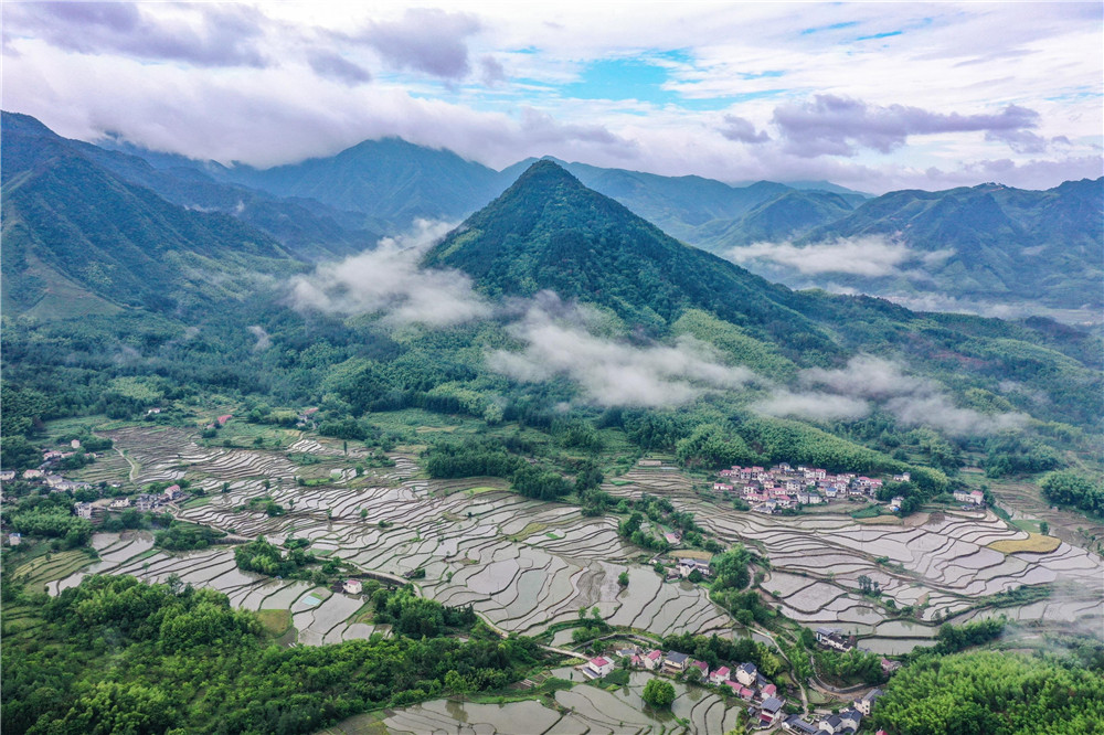 5月17日,在旌德县白地镇汪村,村民抢抓农时对高山梯田进行蓄水,做好插秧准备,层层叠叠的梯田、错落有致的民居在云海掩映下,美不胜收。(通讯员 江建兴 摄)