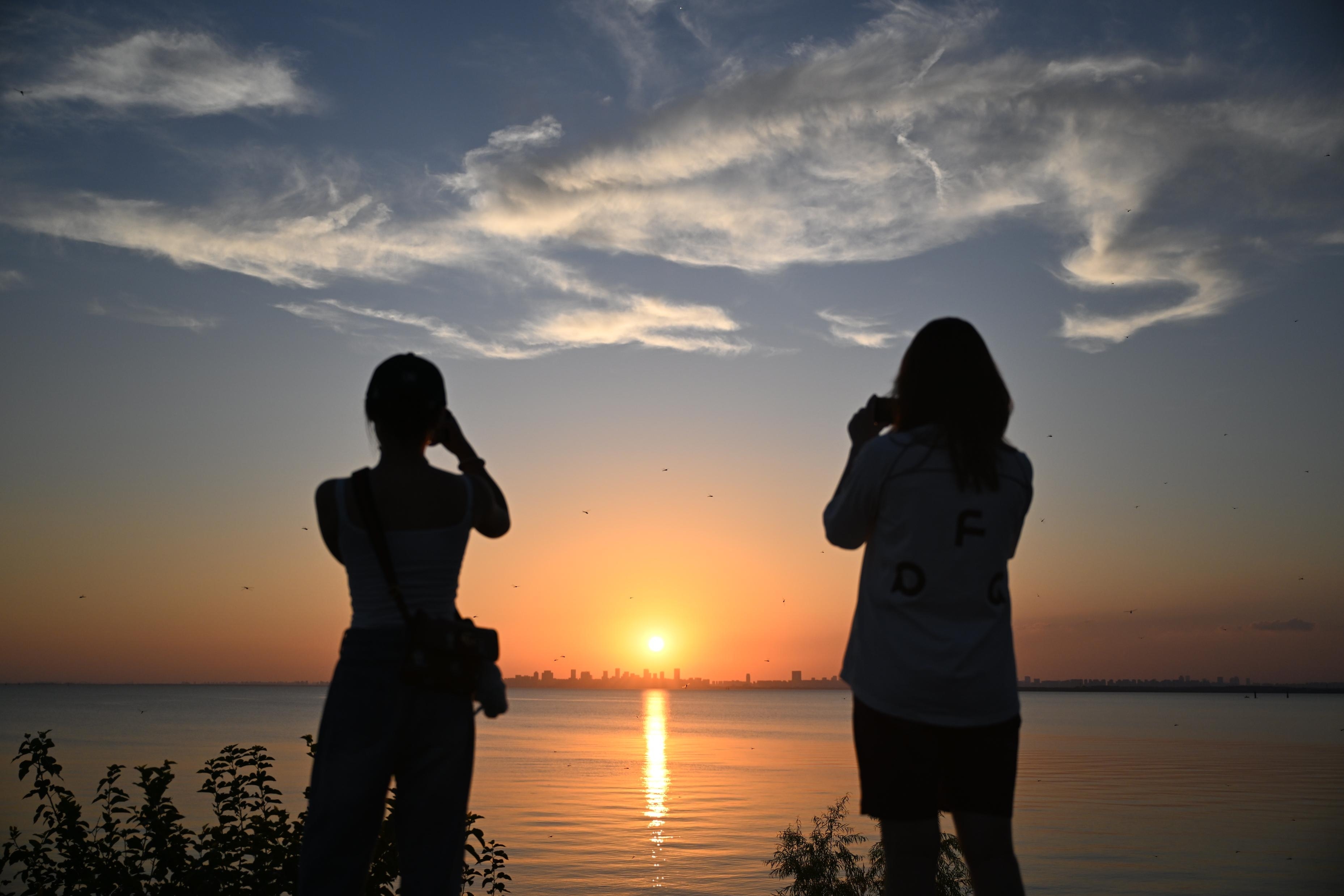 7月26日,市民在肥东玉带河湿地欣赏巢湖日落。
