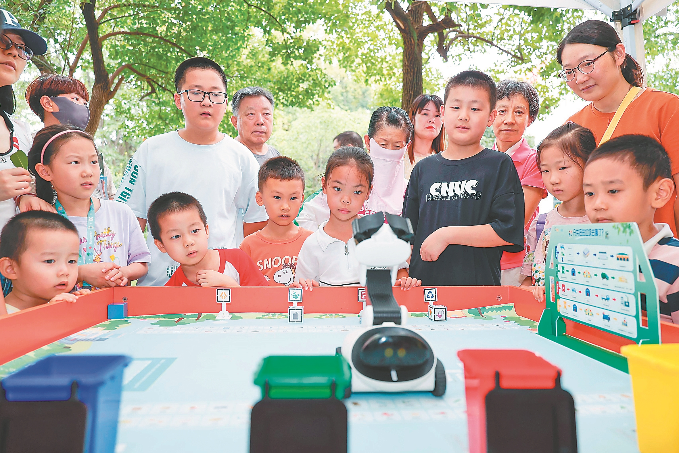 9月6日,合肥市“1986科创园”的“科普市集”,AI机器人化身科普教员,通过编程互动教会小朋友完成垃圾分类。本报记者 范柏文 摄/视觉安徽