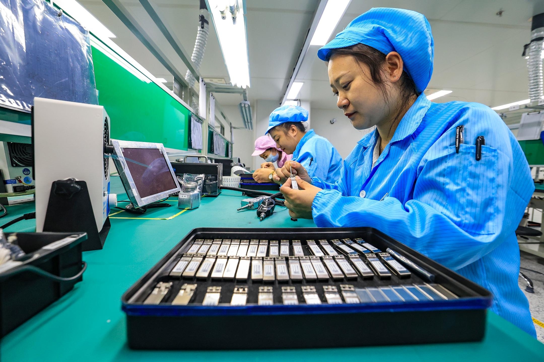 8月19日,马鞍山经开区高新企业安徽共芯光子科技有限公司生产线上,工人在生产应用于5G基站上的光模块产品。特约摄影 王文生 本报通讯员 刘斌 摄