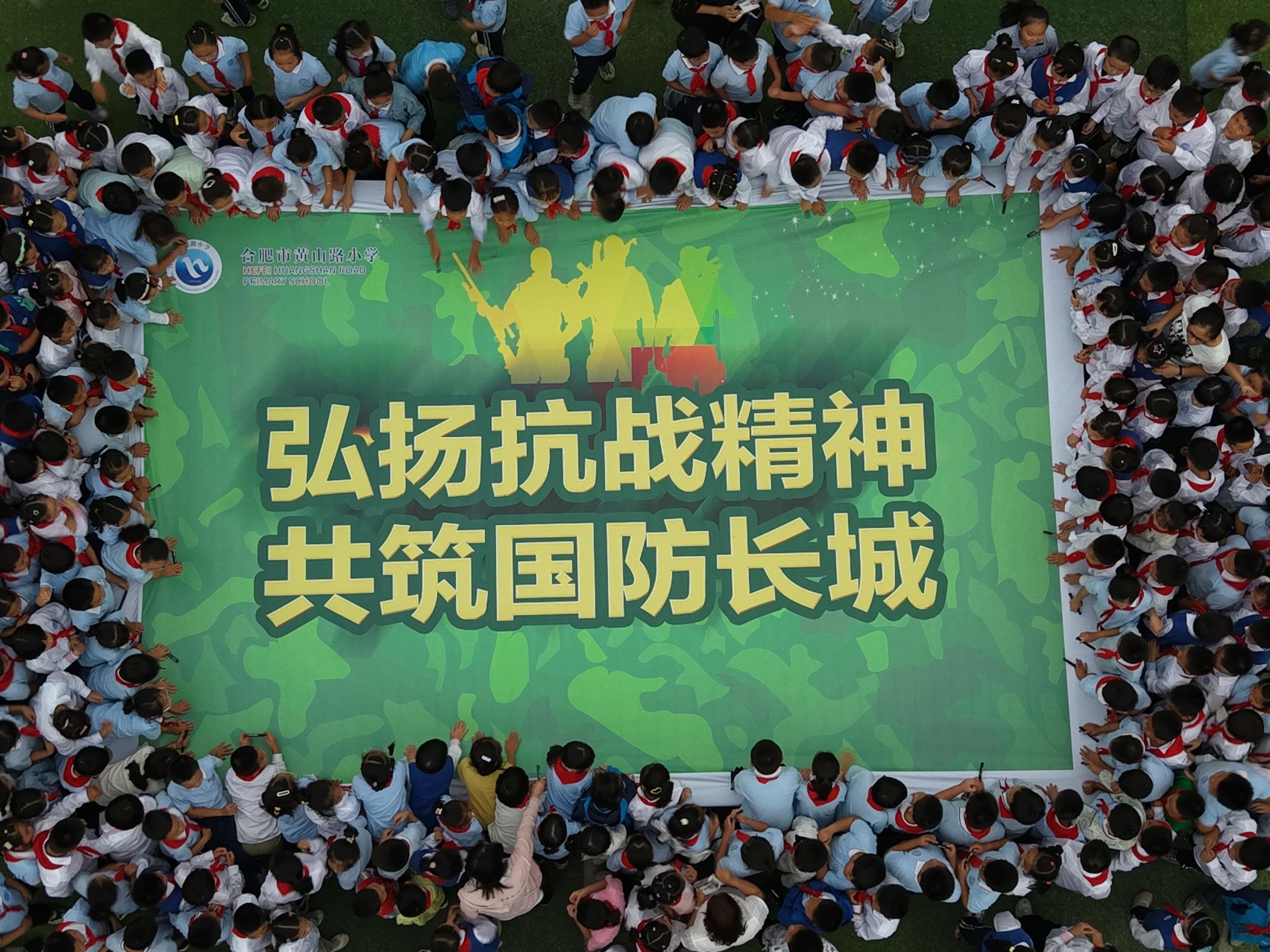 9月18日,合肥市黄山路小学学生在国防主题画布上签名。当天,该校开展“弘扬抗战精神 共筑国防长城”国防教育进校园活动,引导学生树立国防观念,厚植爱国主义情怀。本报通讯员 葛宜年 摄