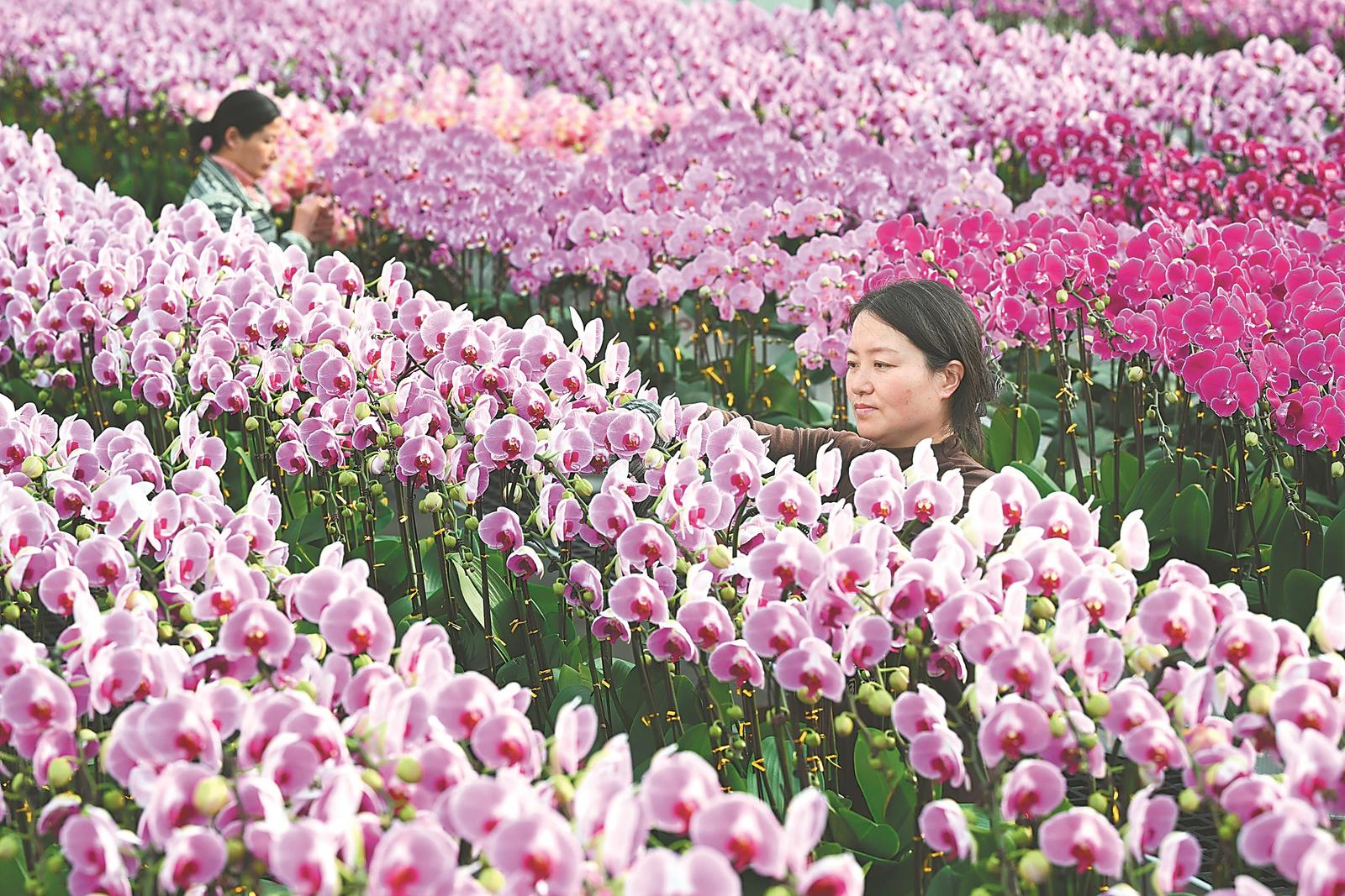 近日,市民在肥西县兰君园艺蝴蝶兰种植基地挑选年宵花蝴蝶兰。本报记者 张大岗 摄