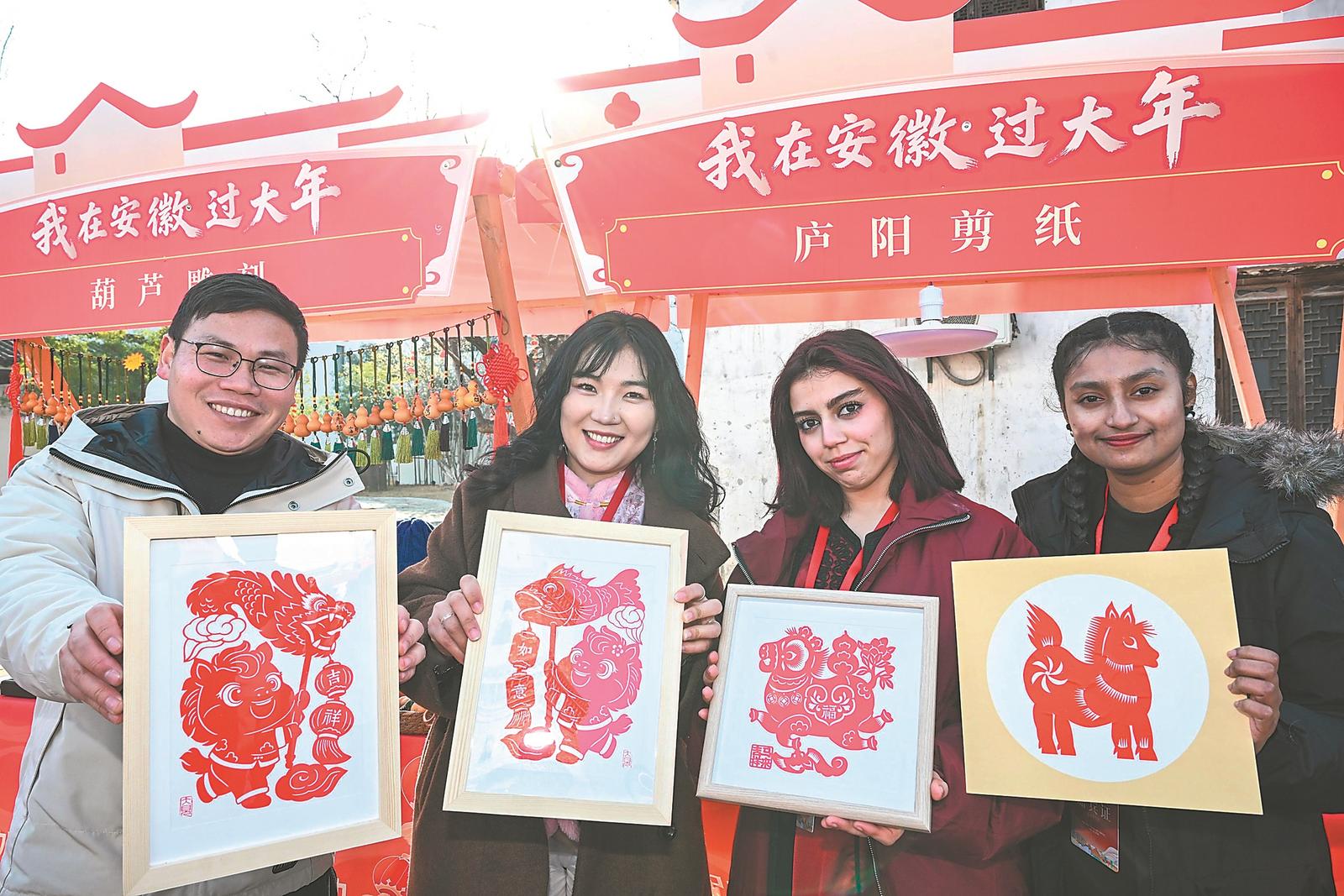 1月23日,在铜陵市义安区犁桥水镇,中外人士共同体验安徽省级非遗代表性项目庐阳剪纸。本报记者 张大岗 摄