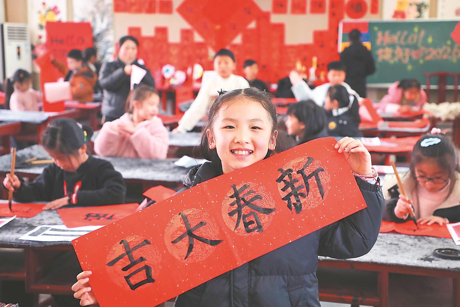 1月23日,六安市金安区人民路小学安丰路校区书法教室里,学生在展示自己的书法作品。本报通讯员 田凯平 刘长明 摄
