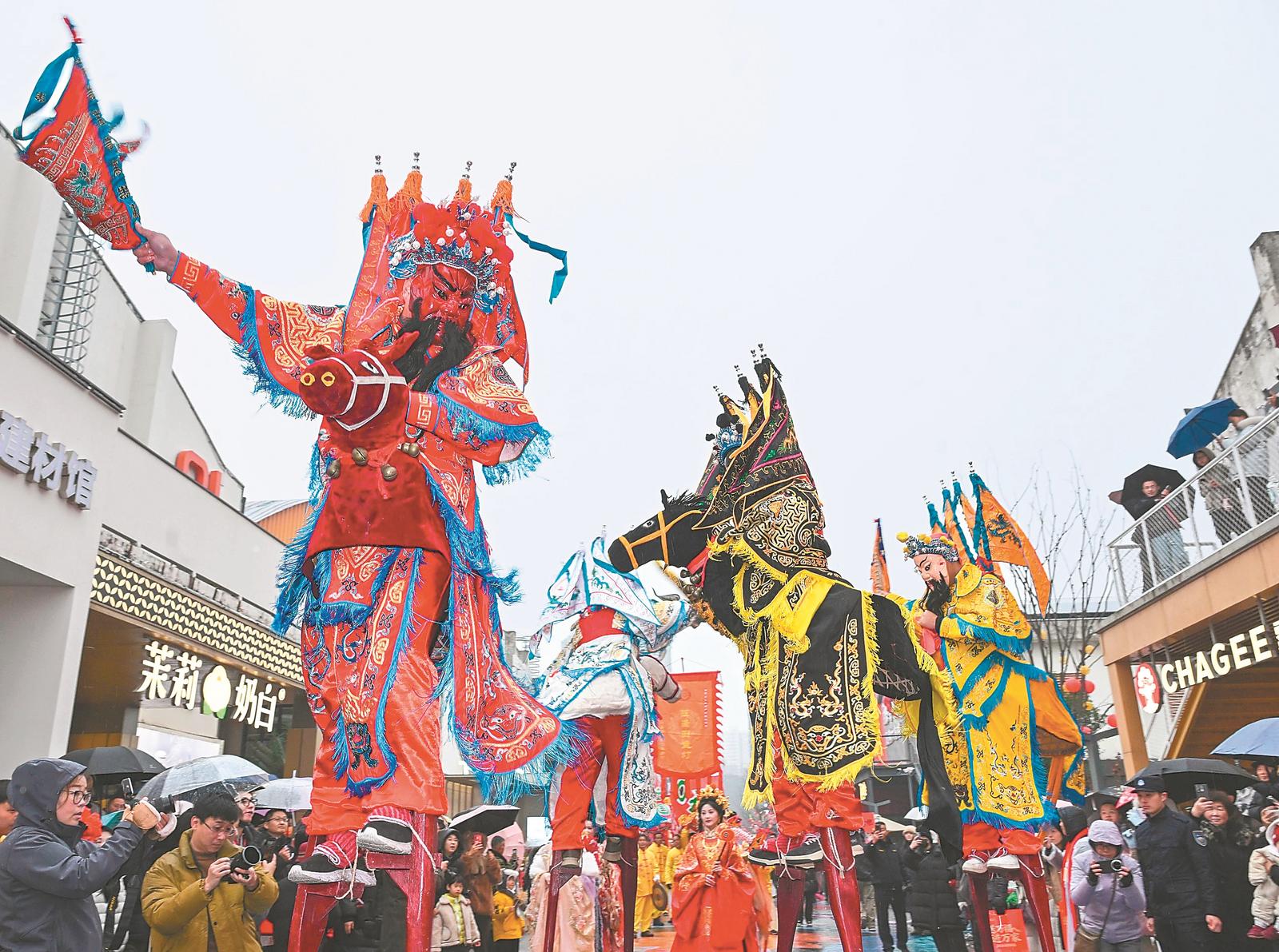 1月25日,在合肥市蜀山区新粮仓街区,国家级非遗代表性项目池州傩戏高跷马表演吸引众多游客围观。本报记者 张大岗 摄