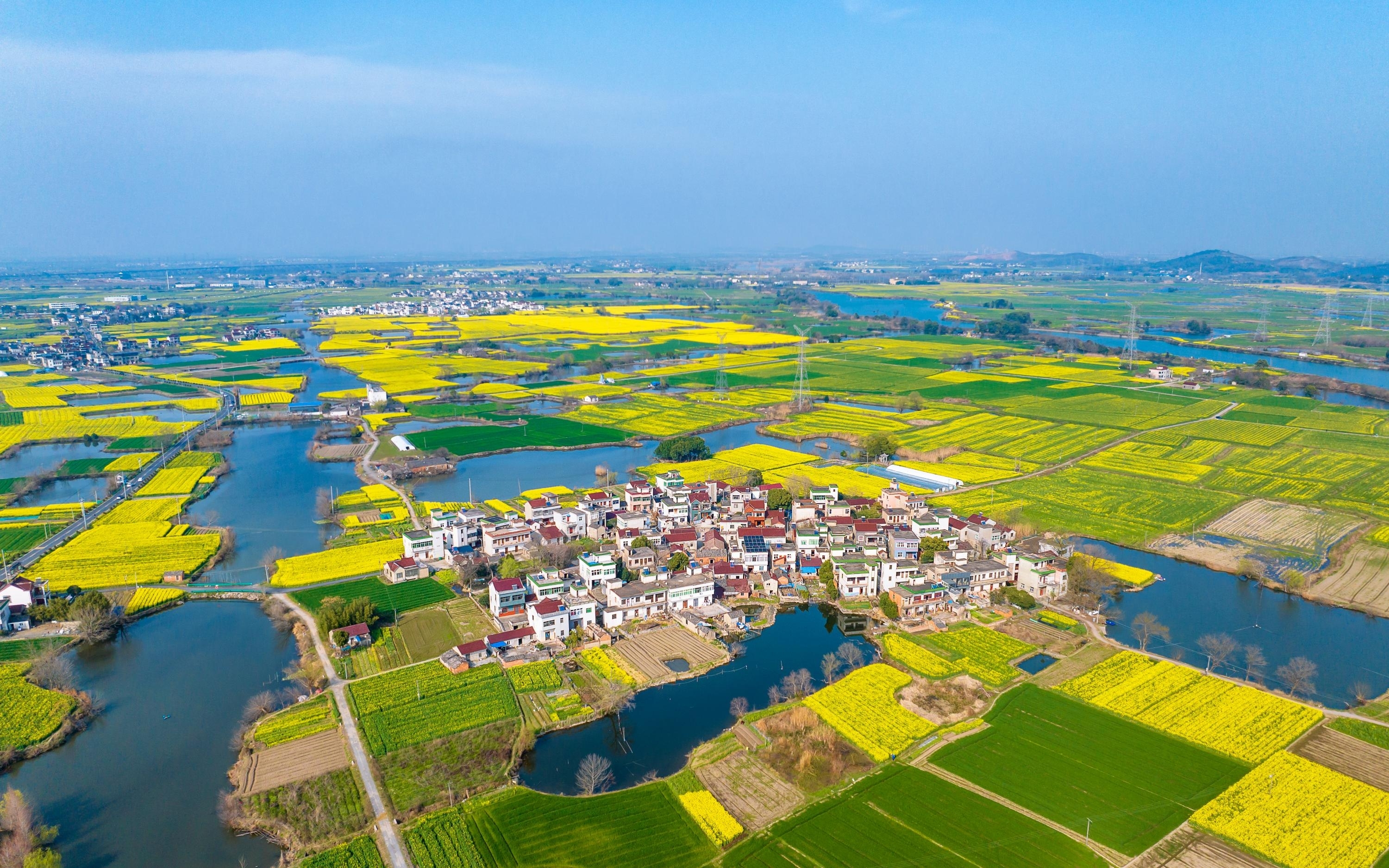 3月8日,芜湖市弋江区峨桥镇响水涧,油菜花海与周边村庄、河道相映成趣,绘就一幅秀美的春日田园画卷。通讯员 张明伟 摄