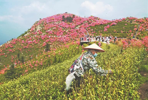 近日,茶农在无为市昆山镇三公山上采摘鲜嫩茶叶。阳春四月,三公山茶山叠翠,万亩茶园吐出新绿,漫山映山红绽放,“茶韵+映山红”农旅融合模式,让当地迎来旅游旺季。(特约摄影师 郑永星 摄)